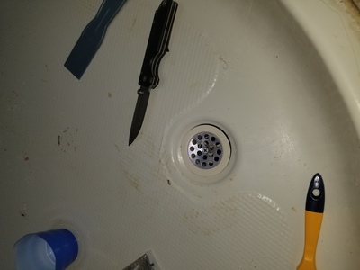 The first step is to clear off anything that is between the resin and the surface you are patching. I started with a plastic scraper so as to not damage the floor much, but quickly advanced to using my trusty pocketknife. D2 steel is up for most any challenge…