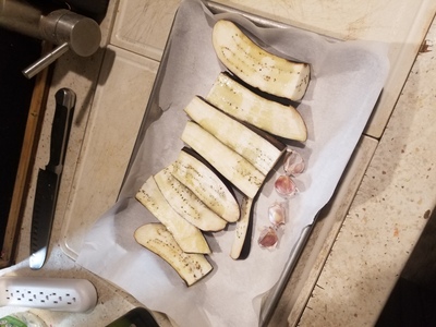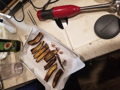The first step is that you have to get everything cooked really well. I put the oiled-and-salted eggplant in the oven (with the garlic) for about an hour-and-a-half at 325 degrees. I didn’t want them to dry out, but eggplant has to cook all the way through. If not cooked long enough it leaves the meat too firm and the skin tough. Cooked too high and it turns crispy.