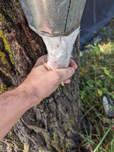 To set up, get your hot water to a simmer (not a rolling boil), fill your cold water container, and hammer your cone into a tree. You want the cone to be about 4 feet off of the ground and pretty secure so the bird doesn’t fall during it’s death throes.