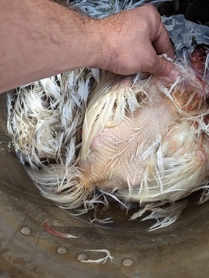 Once you hit your 25 count, dunk the bird in the cold pot. I then find it easiest to pluck the bird while it’s in the water as the feathers come off easier and it’s less messy. Most of the feathers come off pretty easy, but the wings you have to be careful as you can rip the skin in so many ways. Pull the wing and tail feathers out one or two at a time, holding by the base. For the rest of the feathers, pull backwards from rear-to-head.