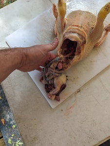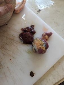 While still holding the anus closed, reach your free hand up as far in to the body as possible, grabbing all of the organs, and then pull them out away from the bird. You may have to pull hard to get the esophagus out, but it will come. There are several organs that are good for harvesting - the liver, kidney, heart, and gizzard. They kidney and heart are the easiest, the liver requires cutting up above the bile duct so that the gall bladder doesn't leak everywhere, and the gizzard is sliced along the middle and turned inside out to remove it's contents and spray out. The last step for the organs is to pull out the lungs, which are located on either side of the spine.