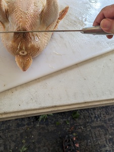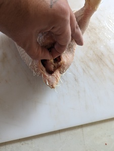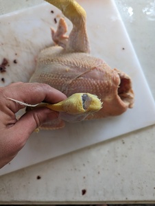 With your plucked bird in hand, now it's time to deal with the innards. Take and turn the bird, feet up, on your cutting board. With your filet knife, cut a line across the top to loosen the gut bag. Next, grab by the anus to keep it closed, and then from the sides of the anus cut upwards to your cross cut, being careful to not cut any intestine and minding the tailbone. Lastly, cut a U around the bottom of the anus to free it from the body.