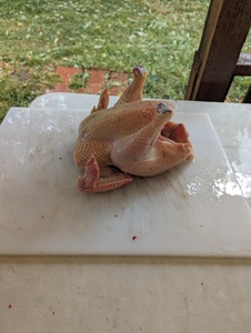 The last step is to turn the bird back over on it’s back. For each of the legs, you bend it back to reveal the joint, and then make a cut a the top, and then from the bottom bring your knife up to sever off the feet. Once the feet are removed, the bird is done processing. At this point I take it inside, where it gets rinsed and any remaining feathers are removed before bagging and putting in the freezer.