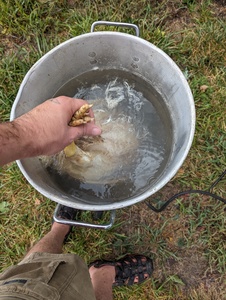First, you need a large pot of boiling water. We use a turkey fryer pot because it allows for us to boil outside unencumbered and provides enough depth to completely submerge the bird. This is important.